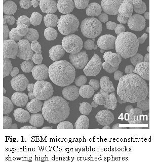 INTRODUCTION. Thermal sprayed WC/Co coatings have been widely applied to machine components. For decades, the engine industry has been developing thermal spray deposition technologies for applying protective coatings to engine parts that experience abrasive, erosive, and corrosive wear. Recently, considerable interests are directed toward the development of thermal spray techniques to deposit dense nanostructured and superfine metal-ceramic composites, e.g., tungsten carbide/cobalt (WC/Co). The extraordinary performance properties of nanocoatings and superfine coatings [1-2] include high hardness and wear properties without concomitant loss of ductility or fracture toughness. For example, thermal spray of nanostructured and superfine WC/Co materials shows many benefits over the conventional coating material. Commercially available superfine and nanostructured WC/Co materials are reprocessed with grain growth inhibitors and alloying additions into the thermal spray feedstocks which are uniquely suited to thermal spray.