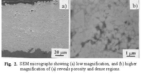 Coating microstructure and hardness. Cross-section SEM examination revealed that all these coatings are very dense. Typical SEM micrographs of the coating cross-sections are showing in Fig. 2. Visual examination of the SEM micrographs revealed less than 3% coating porosity. Particle sizes of the coating are relatively small, range from 100 nm to 400 1mm, with average particle size being ~200 nm. Optical microscopy examination revealed that the as-deposited superfine WC/12Co coatings are very dense, with porosities of less than 1%. The coating density is comparable to conventional micrometer sized WC/Co coatings of similar compositions. Bond strength: The bond strength tests were performed using the ASTM standard pull test (ASTM C633-79). All the samples resulted in glue failure. This glue usually fails at a load of ~ 12,000 psi. Since all of our samples resulted in glue failure, we cannot quantify the exact bond strength of thermal sprayed superfine WC/12Co coatings. Typical thermal-sprayed WC/Co coatings using conventional micrometer sized WC/Co have a bond strength from 9,000 - 10,000 psi.