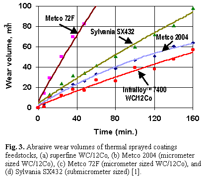 Fig. 3 compares the wear volumes of various grades of thermal sprayed WC/Co coatings. It reveals that the wear volume of InfralloyTM 7412 superfine WC/12Co coated specimens is the lowest. This means that the wear resistance of this coating is likely to be better than Metco Diamalloy 2004 powder. The reason for the good wear resistance is that this material can prove high cross-section microhardness (close to Metco 2004 coatings, 1,000 VHN). This coating also exhibited high surface hardness (higher than Metco 2004, 1,200 VHN) due to the preferential crystal orientation formation in the coating during thermal spray and high toughness due to their smaller grain size.