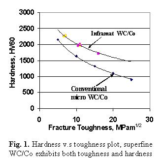 The next step in IMC’s synthesis process is to add a cobalt source into the WC materials to produce a superfine WC/Co composite. Thus, the final powder can be sold to venders as either WC powders or ready-to-press WC/Co composite powders. Under appropriate processing procedures, they can be engineered to either submicrometer particle sized or nanograin sized powders. WC/Co Hardmetal Development -- IMC is developing a variety of leading edge technologies in the area of hardmetals (tungsten carbide/cobalt and its alloys) that enable exceptional hardness in end products comprised of these materials without concomitant loss in fracture toughness. This performance edge is achieved by an important innovation in the alloying of proprietary grain growth inhibitors with tungsten carbide/cobalt powders, both for nanostructured WC/Co and superfine WC/Co. IMC is now developing industrial scale pilot plant capability to manufacture and sell these nanoscale and superfine alloyed powders under the trade names Nanalloy® and InfralloyTM. These proprietary tungsten carbide products can be sold as is for the thermal sprayed coatings industry or in bulk consolidated (sintered) form for the cutting tools and related industries. IMC’s technology is based on a chemical process for the synthesis of WC and WC/Co powders, in which the individual W, C, and/or Co precursors are intimately mixed at the molecular level, yielding a uniquely homogeneous product with exceptional high performance. IMC has developed exceptionally hard bulk consolidated composite materials, with hardness measured up to 2300 VHN. These sintered materials exhibit unparalleled fracture toughness at this level of hardness. These materials are compression sintered in inert gas or vacuum furnaces to form highly homogeneous monoliths. The hardness of the sintered products is found to be a function of cobalt content. Typically, cutting tool applications force the minimum Co content level to be above 6%, below which the material cannot be sintered. Superfine ceramic-Metal (”Cermet”) bulk materials have been shown to exhibit improved wear resistance. The key advantage of superfine cermet is in the greatly improved toughness and hardness, wear resistance. In conventional materials, hardness and toughness are mutually exclusive attributes. Generally, very hard materials lack toughness, and vice versa. Fig. 1 shows that this inverse proportionality is shifted upward and outward in the case of superfine cermets, and effectively, these materials exhibit excellent values for both hardness and toughness. This unusual marriage of properties is anticipated to enable applications where both properties are required. Tooling is a common example of this dual requirement.