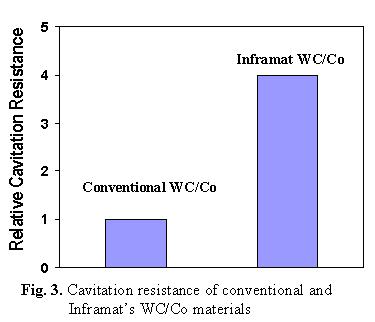 Fig. 3 shows a typical cavitation behavior of the sintered WC/Co Nanolloy Ingot, performed by Hydro-Qubet for hydropower plant applications. As a comparison, Conventional WC/Co was also used as a base line. The data suggested that IMC’s WC/Co composite is at least 4X better than the current used WC/Co material.